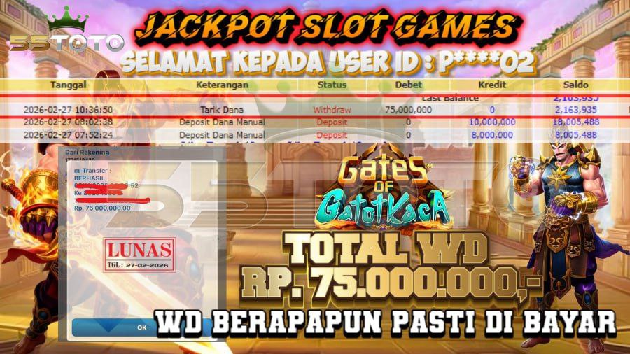 Selamat kepada User id : p***02 Telah berhasil mendapatkan kemenangan besar pada permainan SLOT GATES OF GATOTKACA kemenangan Sebesar 75 Juta , Setelah mengisi formulir withdraw dengan kurung waktu hanya 5 – 10 menit pihak 55TOTO sudah melakukan transfer kepada pemilik Userid dan dana sudah dapat di cairkan oleh pemenang. Bukti pembayaran yang kami berikan merupakan bukti pembayaran yang SAH / VALID yang langung di dapatkan melaui tanda transfer transaksi dari Bank yang di tuju.
