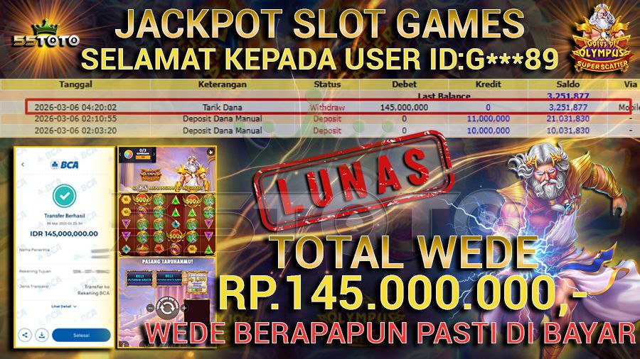 Selamat kepada User id : G***89 Telah berhasil mendapatkan kemenangan besar pada permainan SLOT GATES OF OLYMPUS kemenangan Sebesar 145 Juta , Setelah mengisi formulir withdraw dengan kurung waktu hanya 5 – 10 menit pihak 55TOTO sudah melakukan transfer kepada pemilik Userid dan dana sudah dapat di cairkan oleh pemenang. Bukti pembayaran yang kami berikan merupakan bukti pembayaran yang SAH / VALID yang langung di dapatkan melaui tanda transfer transaksi dari Bank yang di tuju.