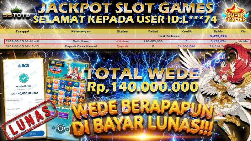 Selamat kepada User id : L***74 Telah berhasil mendapatkan kemenangan besar pada permainan SLOT STARLIGHT PRINCESS kemenangan Sebesar 140 Juta , Setelah mengisi formulir withdraw dengan kurung waktu hanya 5 – 10 menit pihak 55TOTO sudah melakukan transfer kepada pemilik Userid dan dana sudah dapat di cairkan oleh pemenang. Bukti pembayaran yang kami berikan merupakan bukti pembayaran yang SAH / VALID yang langung di dapatkan melaui tanda transfer transaksi dari Bank yang di tuju.