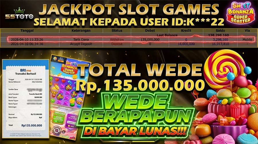 Selamat kepada User id : K***22 Telah berhasil mendapatkan kemenangan besar pada permainan SWEET BONANZA kemenangan Sebesar 135 Juta , Setelah mengisi formulir withdraw dengan kurung waktu hanya 5 – 10 menit pihak 55TOTO sudah melakukan transfer kepada pemilik Userid dan dana sudah dapat di cairkan oleh pemenang. Bukti pembayaran yang kami berikan merupakan bukti pembayaran yang SAH / VALID yang langung di dapatkan melaui tanda transfer transaksi dari Bank yang di tuju.