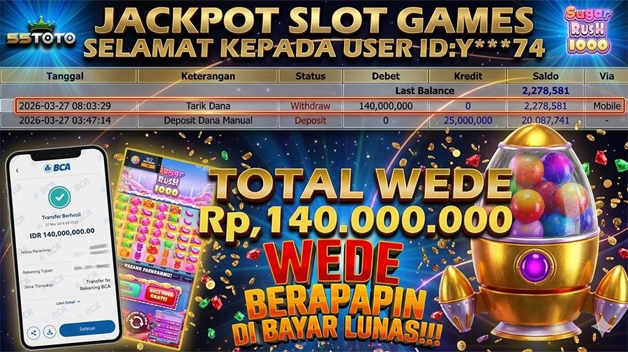 Selamat kepada User id : Y***74 Telah berhasil mendapatkan kemenangan besar pada permainan SWEET RUSH 1000 kemenangan Sebesar 140 Juta , Setelah mengisi formulir withdraw dengan kurung waktu hanya 5 – 10 menit pihak 55TOTO sudah melakukan transfer kepada pemilik Userid dan dana sudah dapat di cairkan oleh pemenang. Bukti pembayaran yang kami berikan merupakan bukti pembayaran yang SAH / VALID yang langung di dapatkan melaui tanda transfer transaksi dari Bank yang di tuju.