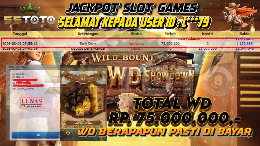 Selamat kepada User id : L***79 Telah berhasil mendapatkan kemenangan besar pada permainan SLOT WILD BOUNTY kemenangan Sebesar 75 Juta , Setelah mengisi formulir withdraw dengan kurung waktu hanya 5 – 10 menit pihak 55TOTO sudah melakukan transfer kepada pemilik Userid dan dana sudah dapat di cairkan oleh pemenang. Bukti pembayaran yang kami berikan merupakan bukti pembayaran yang SAH / VALID yang langung di dapatkan melaui tanda transfer transaksi dari Bank yang di tuju.